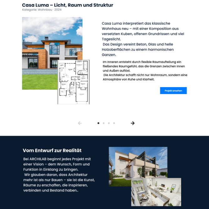 Das finale Design der Archilab-Website vereint ästhetische Klarheit, Funktionalität und Nutzerfreundlichkeit. Alle Elemente – von Layout und Typografie bis zu Farben und interaktiven Features – sind sorgfältig aufeinander abgestimmt, um die Markenidentität zu stärken. Die Website ist responsiv, auf allen Geräten nutzerfreundlich und bietet eine intuitive Navigation, die Besucher:innen nahtlos durch Inhalte wie Projekte, Team und Vision führt.
