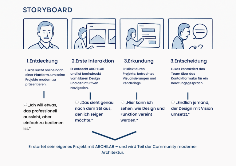 Das Storyboard zeigt Lukas‘ typische Schritte auf der Website – von der ersten Recherche über das Entdecken von Projekten bis zur Kontaktaufnahme. So konnte die Nutzerführung gezielt auf seine Bedürfnisse abgestimmt werden.