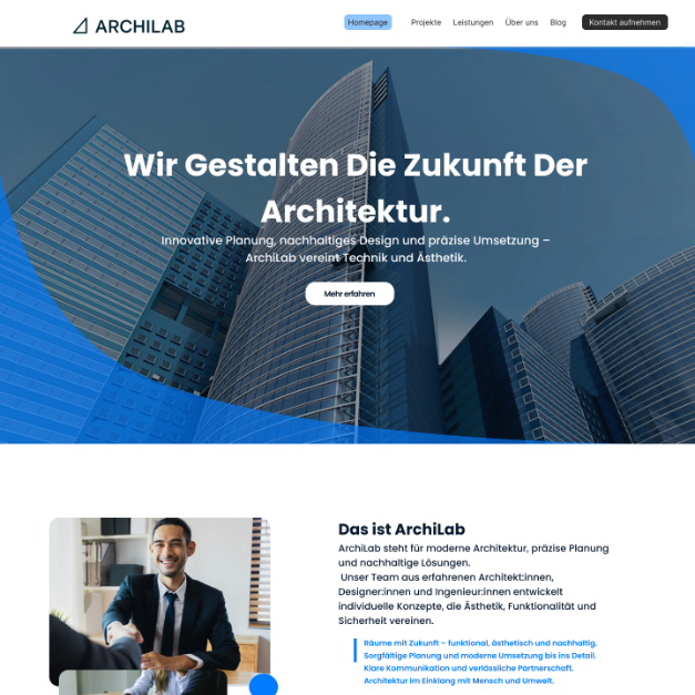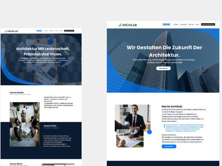 Umsetzung des finalen Designs, z. B. Archilab, mit HTML, CSS und JavaScript, inklusive responsiver Layouts und interaktiver Elemente. Fertige Website getestet auf verschiedenen Geräten und erfolgreich online gestartet.