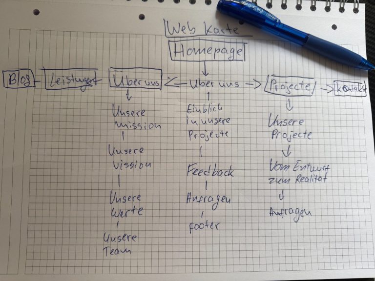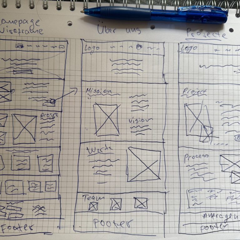 Die Website-Struktur umfasst Homepage, Über uns, Mission, Vision, Team und Projekte. Wireframes visualisieren Layout und Nutzerführung als Grundlage für den Prototypen.